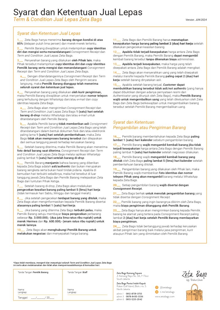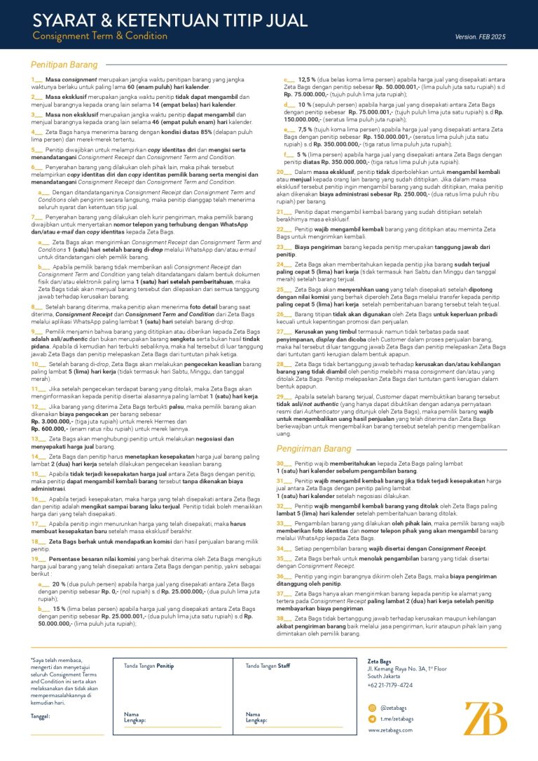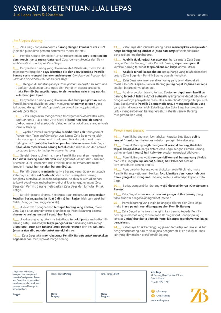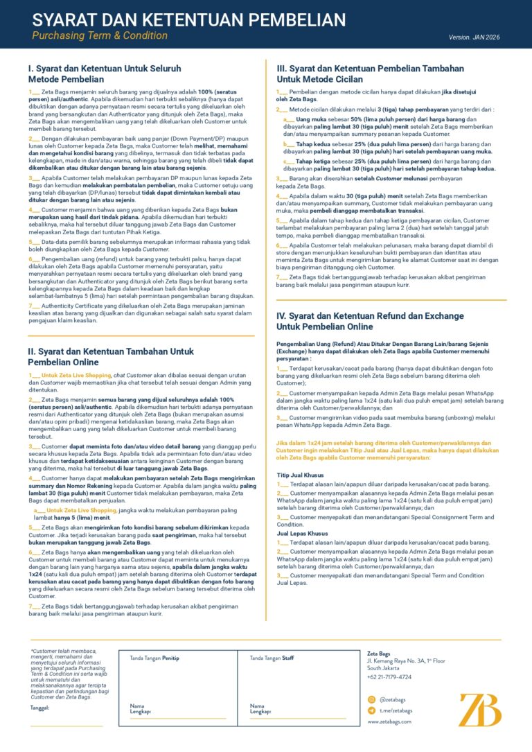 Setiap pembelian barang dari Zeta Bags mulai dari 11 Desember 2025 akan mendapatkan Certificate of Authenticity yang merupakan komitmen kami untuk selalu menjualkan barang luxury yang asli. Berikut syarat dan ketentuan penggunaan Certificate of Authenticity